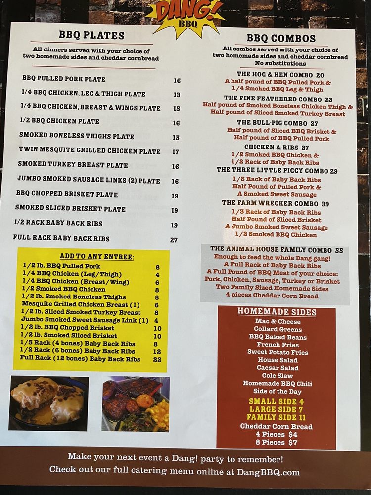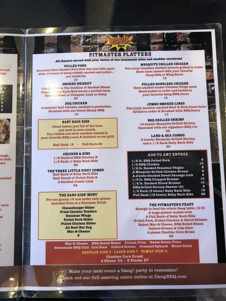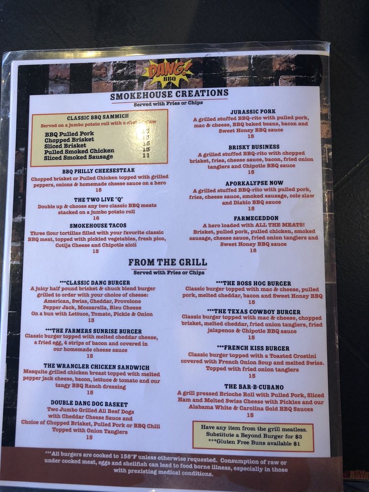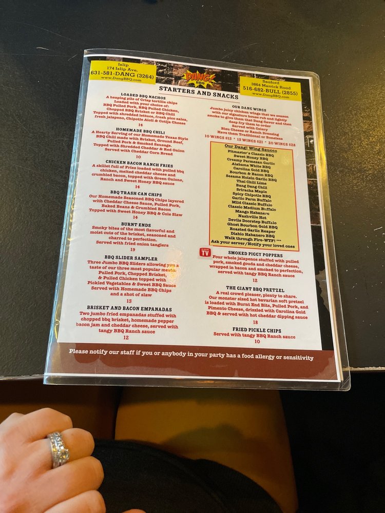 Introducing the menu at Dang BBQ, located in Seaford, NY, offers a delectable selection of chicken wings with a BBQ twist. Their jumbo wings are marinated, seasoned, and smoked to perfection, then fried to order and tossed in their signature sauces. The menu also boasts an array of mouth-watering Roadhouse Shakes and America's Best Burgers, including the Black Magic Veggie Burger and the Boss Hog Burger. Customers rave about the perfectly cooked brisket, delicious ribs, and indulgent burgers offered at Dang BBQ. The friendly staff, lively atmosphere, and generous portion sizes make this Southern BBQ joint a must-visit on Long Island. Don't miss out on trying their Alabama white sauce and be prepared to indulge in a true roadhouse experience at Dang BBQ.
